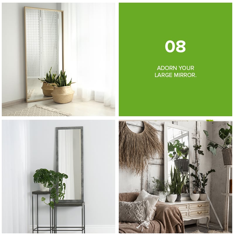 Mirrors can make a room look larger and feel more open. However, large mirrors can at times be distracting. To counterbalance the effect, place a few tiny plants or cute topiaries in front of it. You can use plant pots or containers that match the color of your mirror frame for a more harmonious effect.