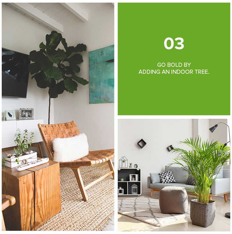 Want to try something different? Go over the top with an enormous potted tree that can add a burst of life to your space. It's perfect if you are already tired and bored of the usual small house plants, you have a minimalist home, or if you don’t have enough space or budget for lots of plants.
